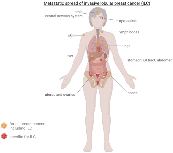 When lobular breast cancer spreads to other parts of the body, it can be more difficult to detect. ILC metastases are often less visible on standard scans.
